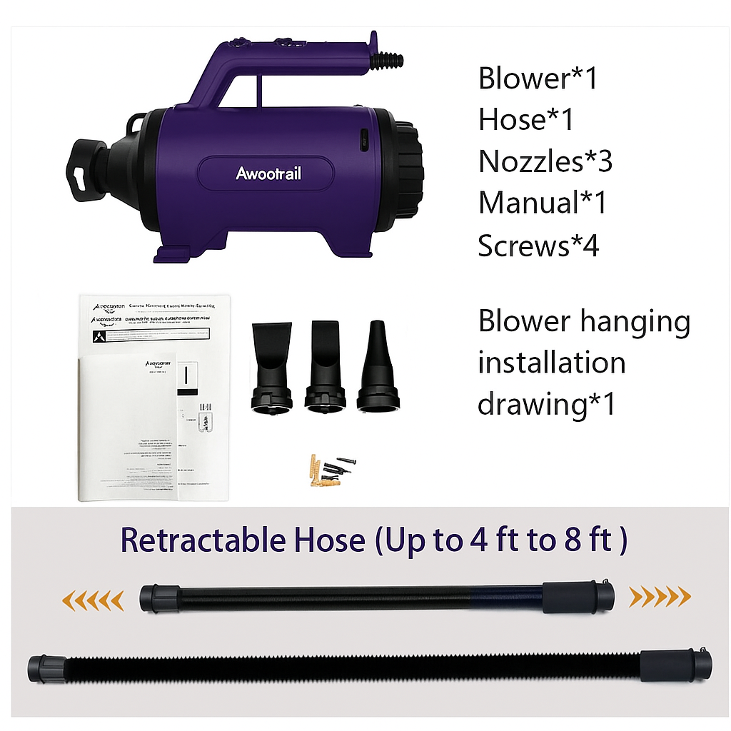 - Complete Accessories – Includes a flexible 4–8 ft hose, 3 nozzle attachments, wall mount kit, and air filters for versatile grooming needs.