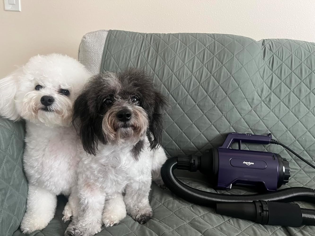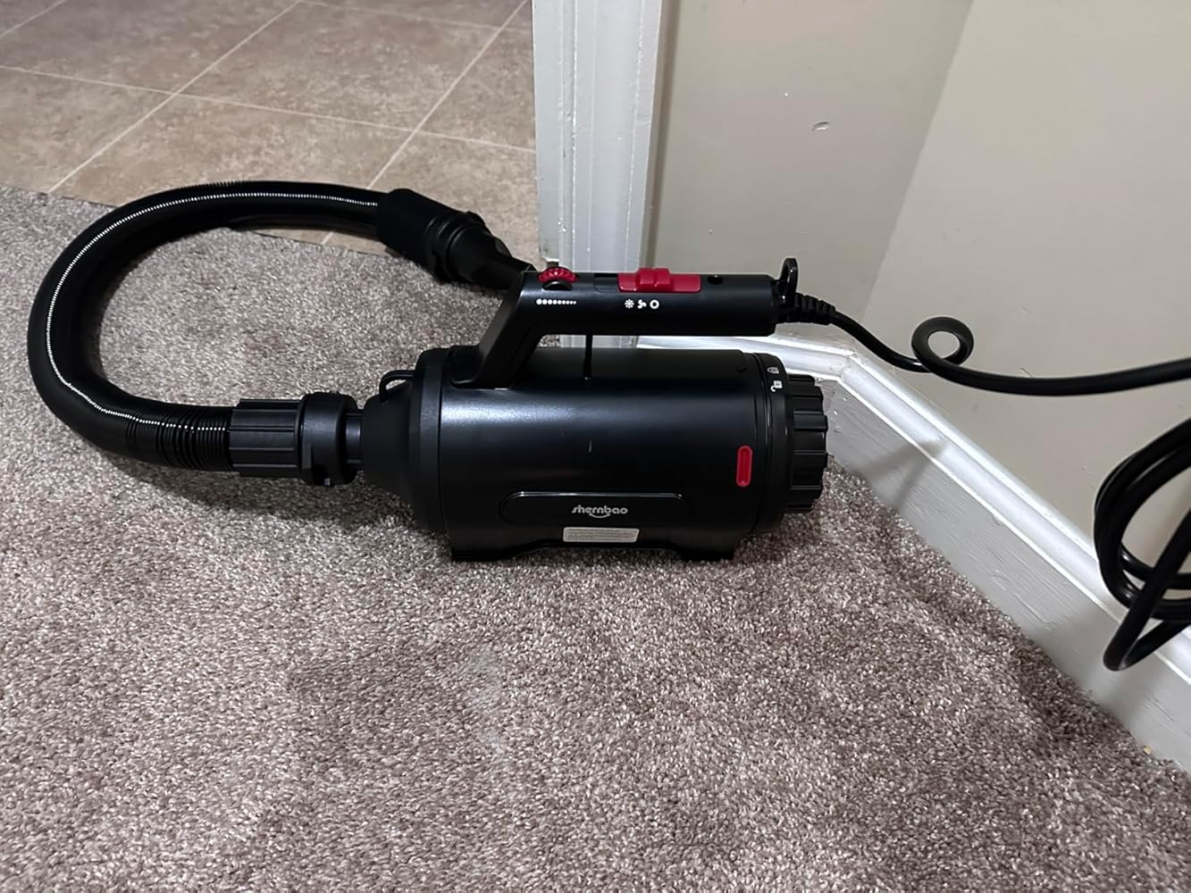 This lightweight dryer is compact and did an amazing job drying my two dogs. I wash them in between grooming sessions. I like the variability in wind speed and the heat setting, that doesn’t get burning hot, just a tad bit of warmth. It sounds like a shop vac when it’s on. The hose and nozzles are easy to connect. I am happy with my purchase.