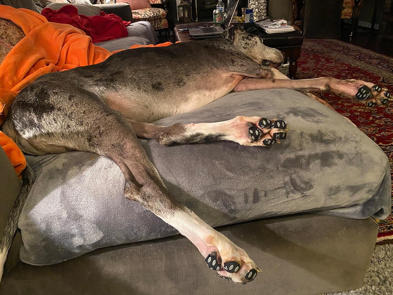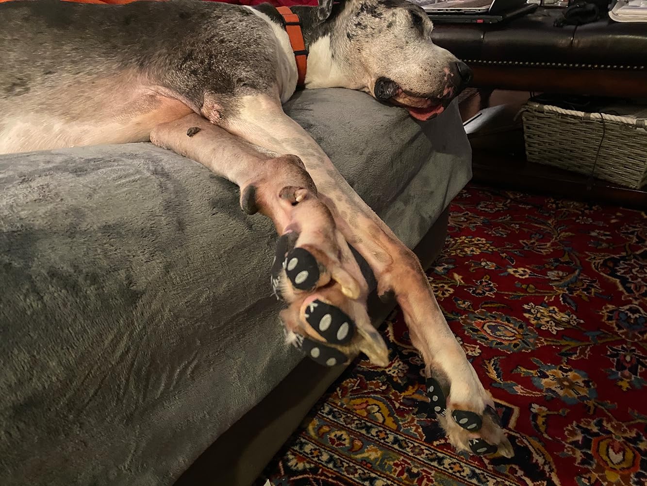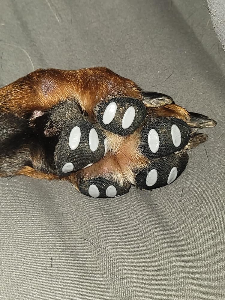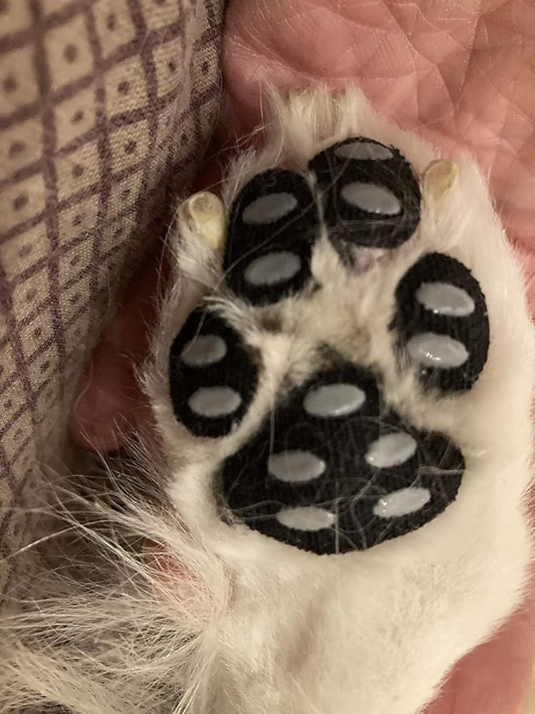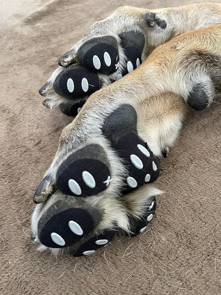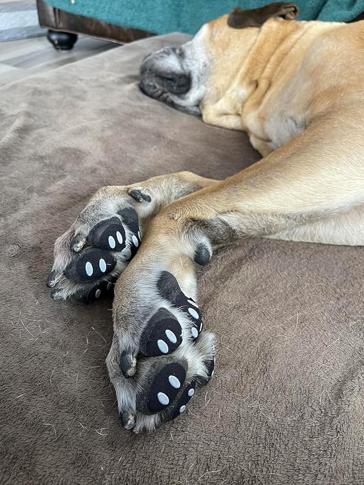 This product is genius. We purchased these hoping to help our 11-year-old Doberman with his stability walking around on tile and wood floors. It did just that! To get the best bang, I trim these to fit the individual pads of his feet. This allows for clean continuous adhesion and keeps out debris. These stick for around 2-3 days (losing 1 or two toes here or there). The only reason I am giving 4 stars is because it is about a 15 minute craft project, however Syn does not mind a foot massage at all.