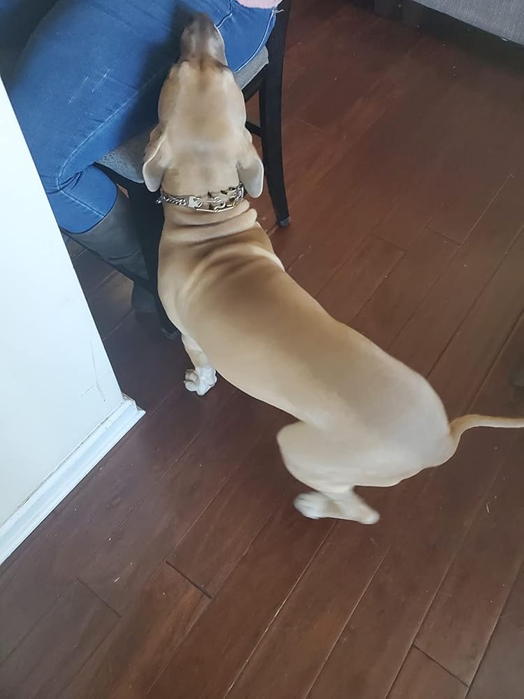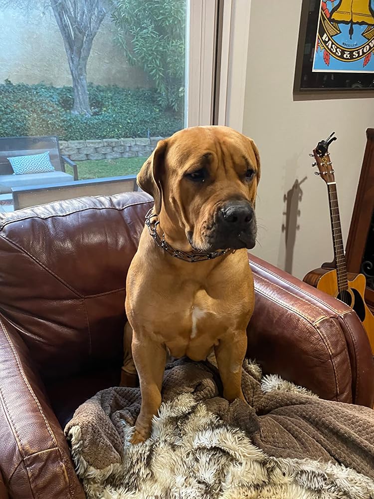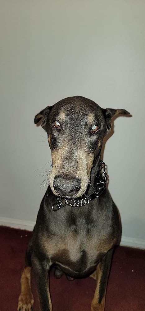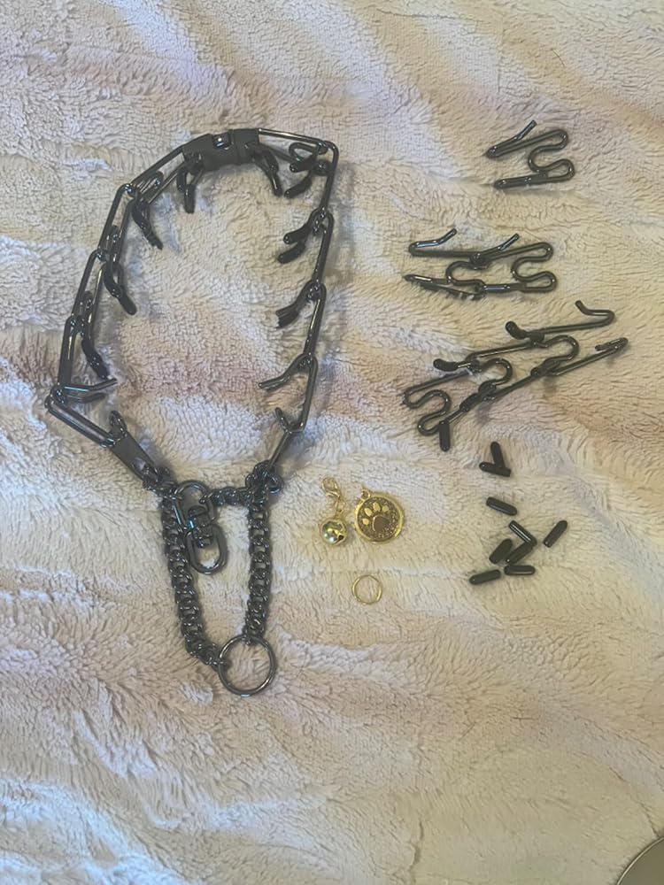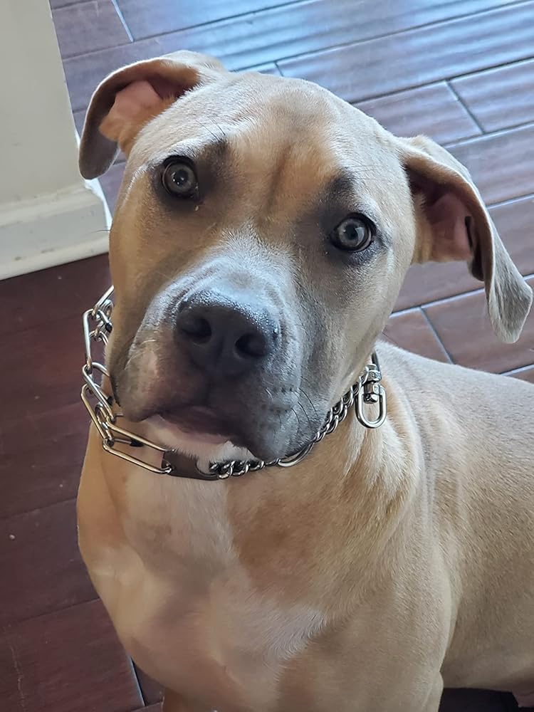 Our 1 year old pup loves this color. Rubber tips prevent injury and it’s easy to adjust to fit neck size. She is 120 lbs and we removed 2 links to fit just right. Also easy to snap on and off