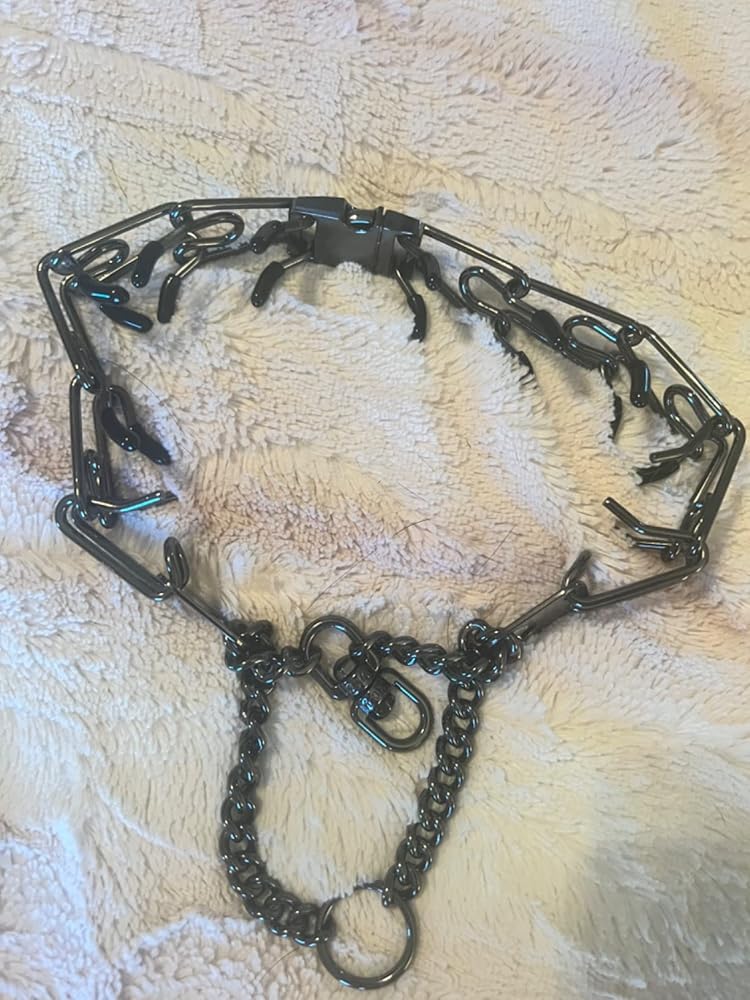 I like that this dog collar is simple to put on. It has a quick release latch for ease of getting off as well. We have a German Shepherd who is very strong, as well as strong willed. She likes to try to go her own way even when she shouldn’t, such as going towards the road. That’s when this prong collar comes in handy. A quick tug and she quickly gets by my side again. She is less likely to stray away from me when using this color and leash. The prongs have rubber tips so she is not harmed. The collar is very durable and sturdy, it has to be or certainly would not be working for our dog! She is still growing, this collar can be adjusted as she gets bigger.