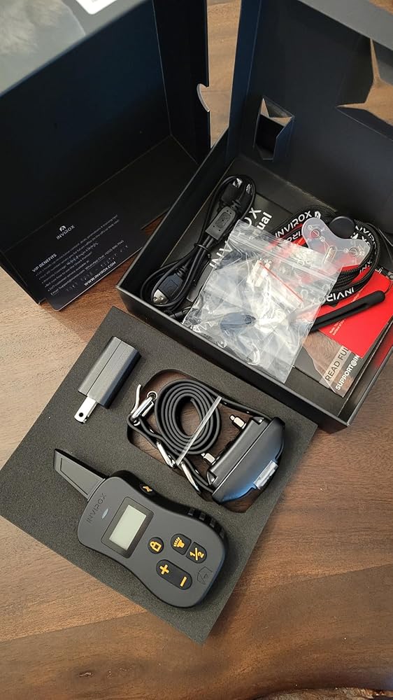 We really like this INVIROX Dog Shock Collar. It came in a sturdy, lidded box that's good for storing all the extra items. There are 2 straps to choose from, and a charging cord (which conveniently includes an AC adapter) that works for both the collar and the controller at the same time. The included direction booklet is easy to follow, so we were able to get going with this collar in just a few minutes. (Both our collar and controller came with a charge right out of the box.) When we were testing this out before putting it on our dog, he was already reacting to the sound mode, even though he wasn't wearing the collar yet, and both the vibration and shock modes start very low and increase from there. Once he had it on, he definitely was reacting to all the modes, especially the shock mode, which we only got up to about 20 before deciding to turn it down a bit. Vibrate also gets his attention. So far we are really pleased with this and it's working well for us at redirecting and getting our dog's attention.