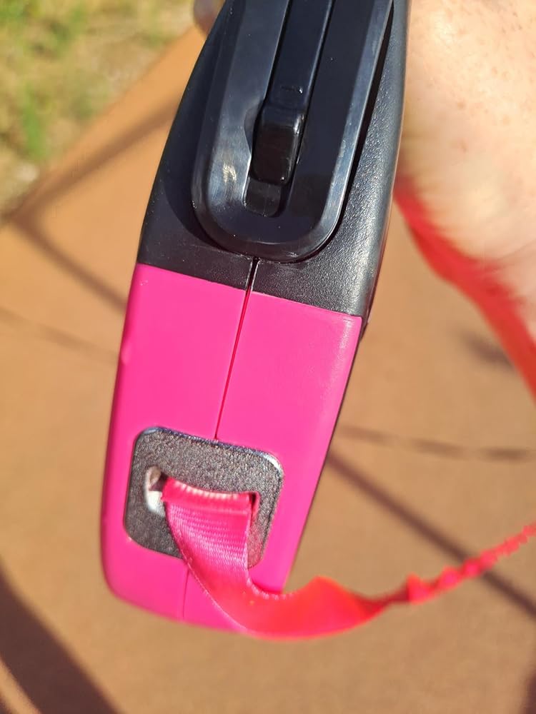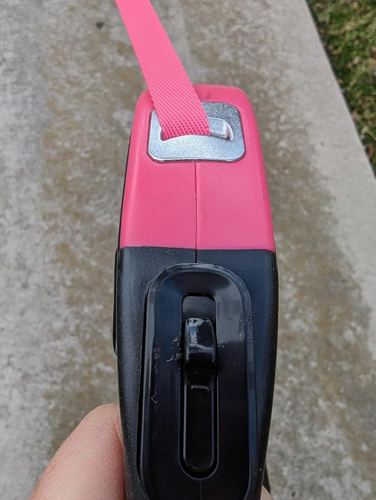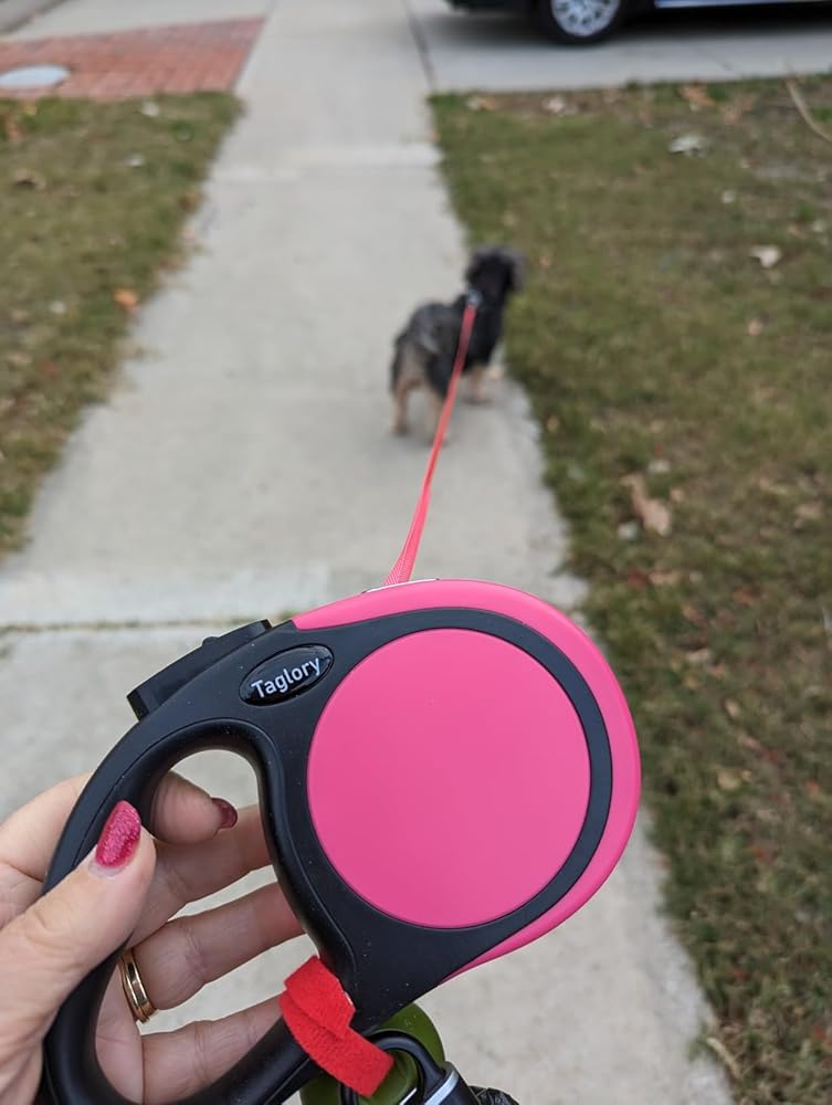 While walking my little dog this week, the leash I was using broke and the ribbon separated from the plastic housing. Fortunately, my little dog was busy sniffing a tree and never noticed that she had total freedom! When I returned home, I went on Amazon to find a replacement leash.There were so many leashes to choose from and many good prices since it was Cyber Monday. I finally settled on this leash, which wasn't the least expensive, but had many good reviews. I am now adding my positive review to the list.The leash feels very sturdy in my hand. It has a little bit of weight to it but not so much as to be uncomfortable on a long walk. The ribbon comes out smoothly and so far I haven't had any trouble with it tangling. The lock works easily and holds well. It is very simple to unlock or to pause my little dog while walking. The ribbon is wide enough that I can grab it if necessary without worrying about burning or cutting my hand.This is a much better quality leash than the one I had purchased previously and I'm very happy with it. The pink color is vivid and contrast well with the black on the handle.